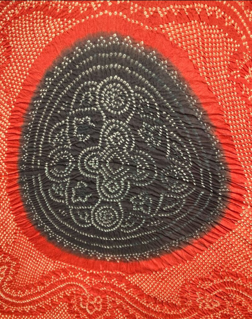 A khombi shawl is worn by brides of the Khatri and Muslim communities in Gujarat. It is made using the bandhani technique and is traditionally red and black with white dotted patterns. Bandhani is derived from the word ‘bandh’ which means ‘to tie’. It is a tie-dyeing technique used to make patterned fabrics which are identified by light circular or square-shaped repeating motifs on a dark background. In Kachchh, the craft is mainly practised by the Khatri community.