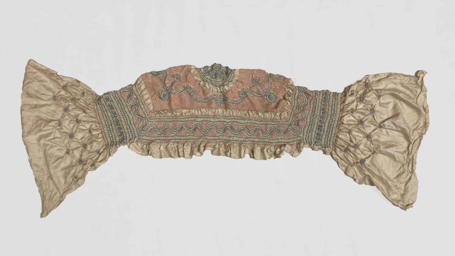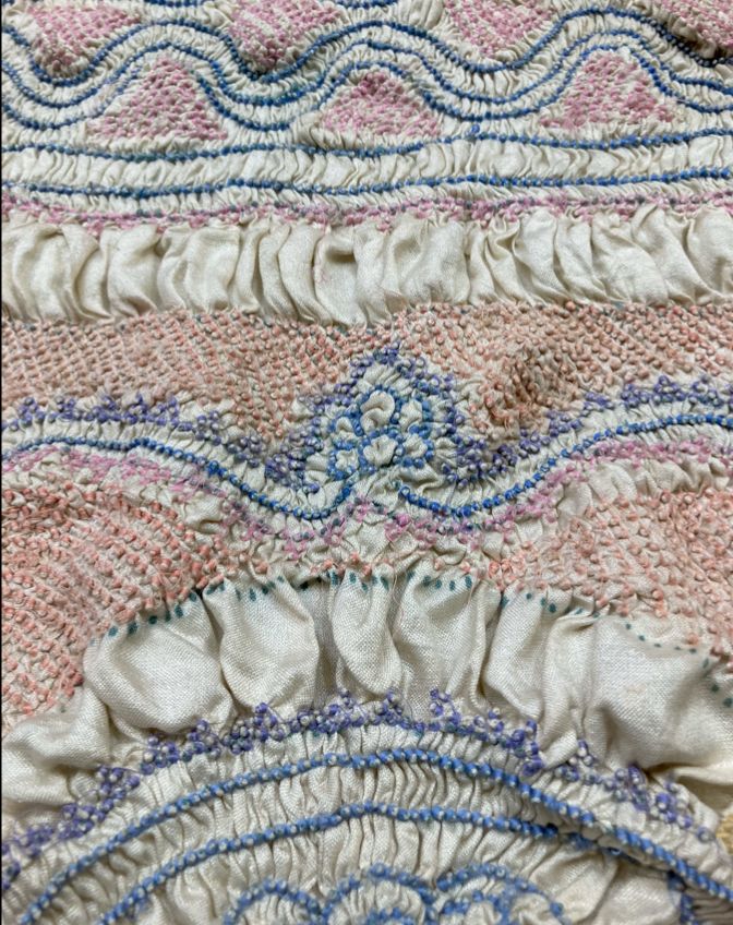 These two textiles are identical in design and show intermediate stages of the tie and dye process. Above shows the tied knots before being dyed and the other image below shows it after being dyed red with madder.