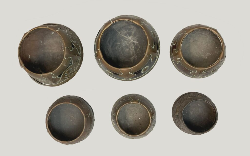 Our object in focus this month is this set of grain measures called kunke or sherpai from West Bengal, India. They are made specifically in Lokepur village in Birbhum district. The word sherpai is derived from two terms: ‘ser’ and ‘pai’ that are units of weight used in Bengal before the metric system was introduced as the standard for weights in 1956. Ser is a unit of weight equivalent to 80 tolas (1 tola = 11.664g). This equals 1 ser to almost 1 kilogram and ‘pai’ equals half a ser.