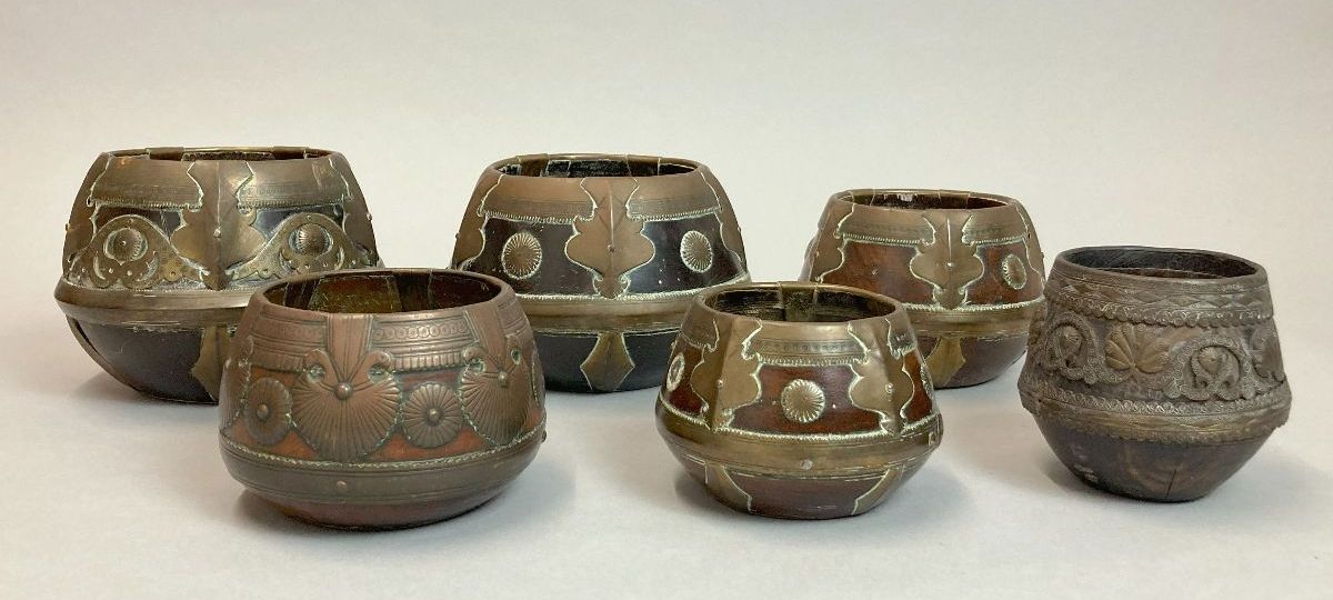 We have seven examples at The South Asia Collection. We think these could be from different sets owing to two main reasons. The designs on some of them are evidently different to each other and the type of wood appears to be different too. In the possibility that it could be a set, it is highly likely that it is an incomplete one because the size difference between the largest measure and the second largest is more than the standard difference of measurement between two measures.