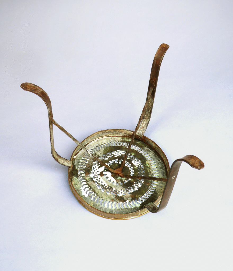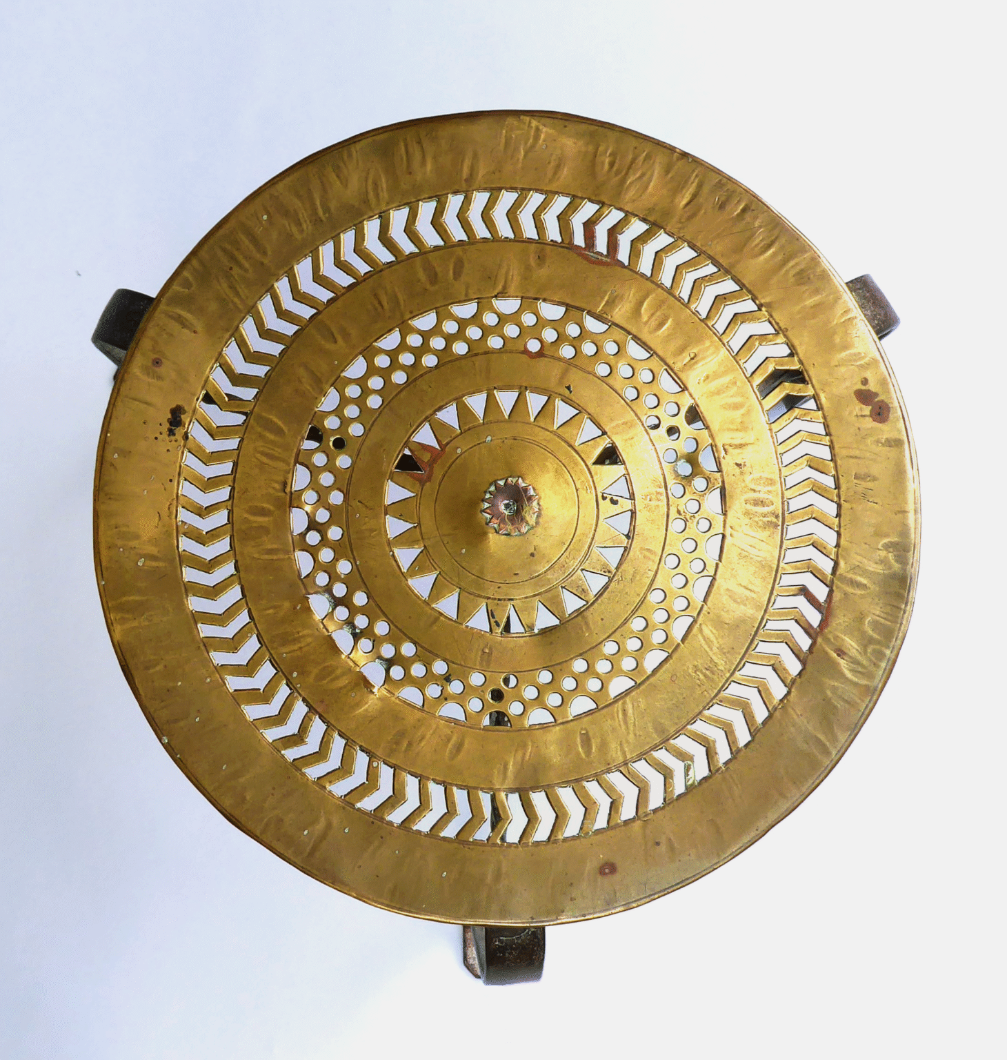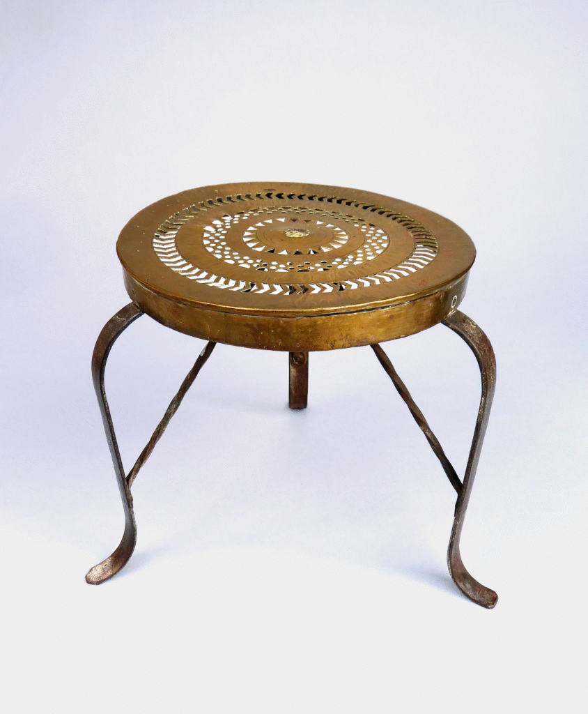 The name tarpai is derived from the word – teen pai (three legs) in Hindi. The three legs are made from iron and the top from brass. They are joined to one another with the help of a peripheral metal sheet fixed at the underside of the top section. The legs are supported with three iron rods fixed to the surface which act like brackets. The top is decorated with patterns using piercing techniques.