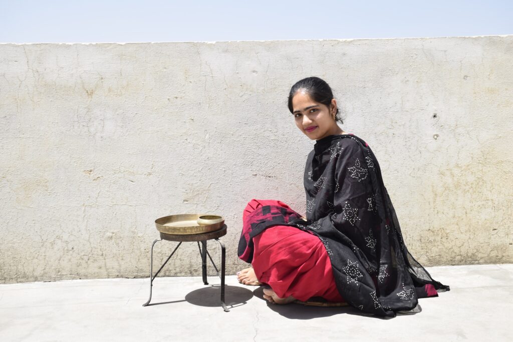 When the research team was in Punjab, they met Balkar Hansji in Sangrur who kindly invited them to spend some time at his family’s house. In a small room on the terrace of the house, Balkar Hansji had stored several old objects and furniture. Among these was a tarpai (low table) that he brought out for the team to see. He said that a tarpai was used to place a plate on while eating a meal. Rice or roti, sometimes both are served on a thali (plate) with dal, vegetables, and other accompaniments in katori (bowls). The thali would be placed on the surface of the tarpai. While the team photographed the tarpai, Balkar Hans’s daughter brought out a mudha; a type of floor seat used in Punjab. She explained that while eating in such a manner, the person would sit cross-legged on a mudha.
