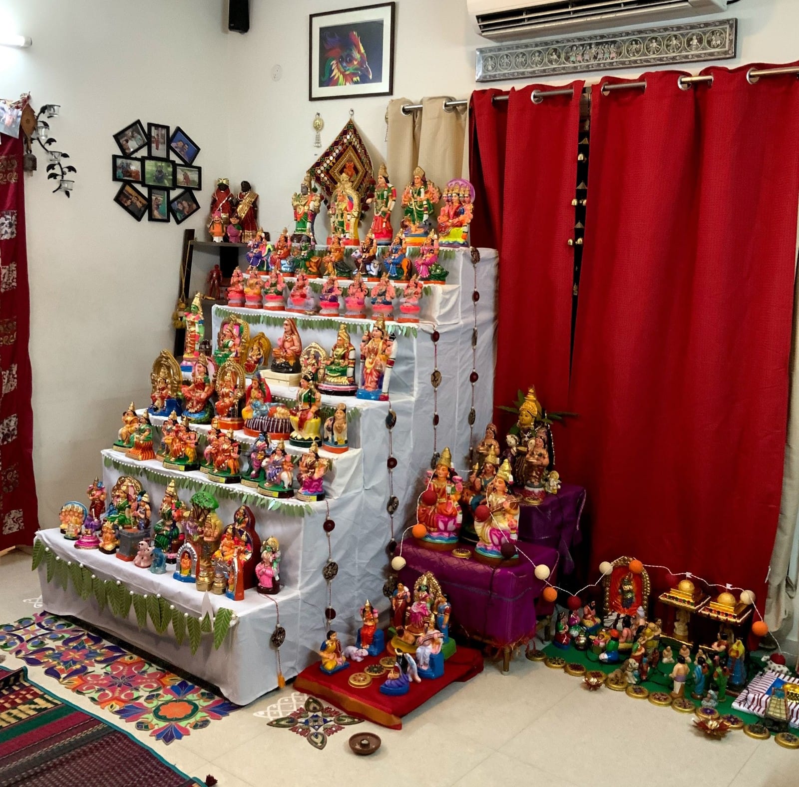 During Navratri, families in southern India, particularly Karnataka, Tamil Nadu and parts of Andhra Pradesh, put together a display of dolls at home that are collected over generations. It is called by a variety of names: Gombe Habba in Karnataka, Bommai Kolu in Tamil Nadu and Bommala Koluvu in Andhra Pradesh, translating as a festival or court of dolls. Colloquially, it is also called Golu or Kolu across the states.