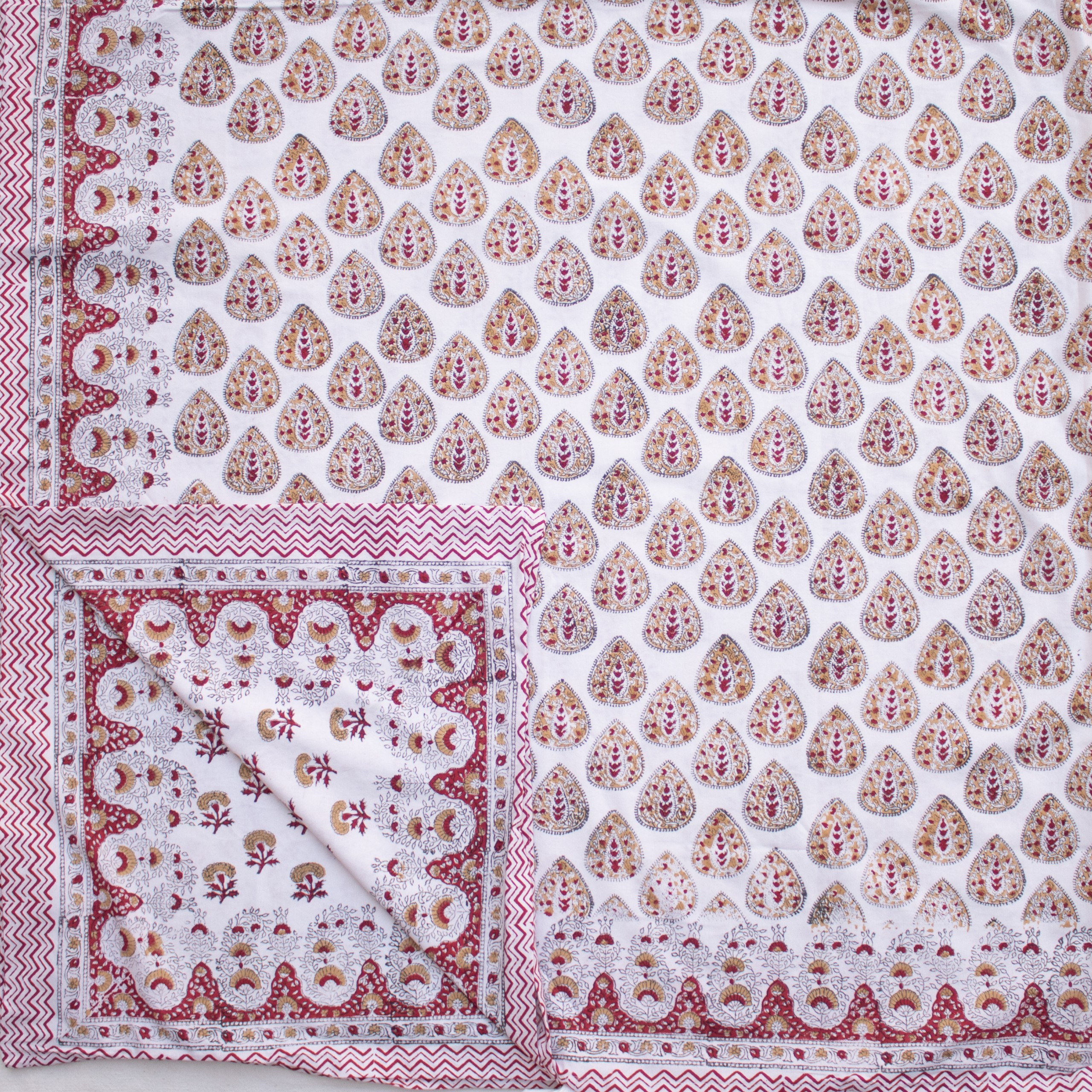 This duvet cover is handmade in India using traditional block printing techniques. It is reversible with designs on both sides. It is made entirely from cotton with ties at the end for fastening. There will be subtle irregularities in pattern and colour which is characteristic of the craft process. This makes each piece unique.