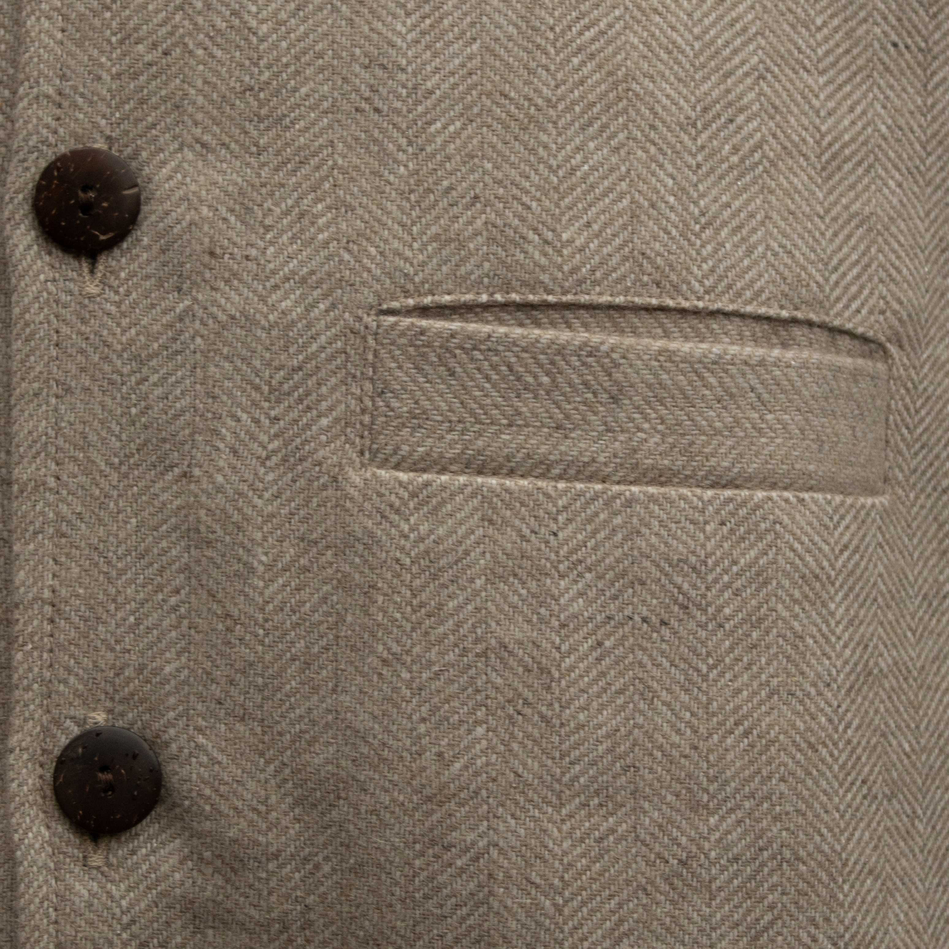This single sided woollen waistcoat comes in a herringbone design, whilst the inner lining is a stylish striped cotton. There are pockets on the inner side for your wallet or glasses. All our waistcoats come with two replacement buttons. Made in India.