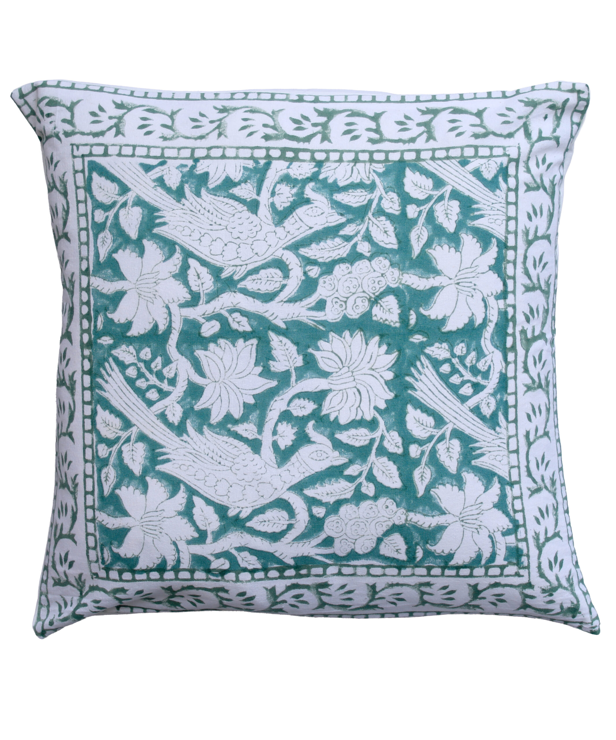 This cushion cover is handmade in India using traditional block printing techniques. Made entirely from cotton, it is printed on the front with a plain back and an envelope opening. There will be subtle irregularities in pattern and colour which is characteristic of the craft process. This makes each piece unique.