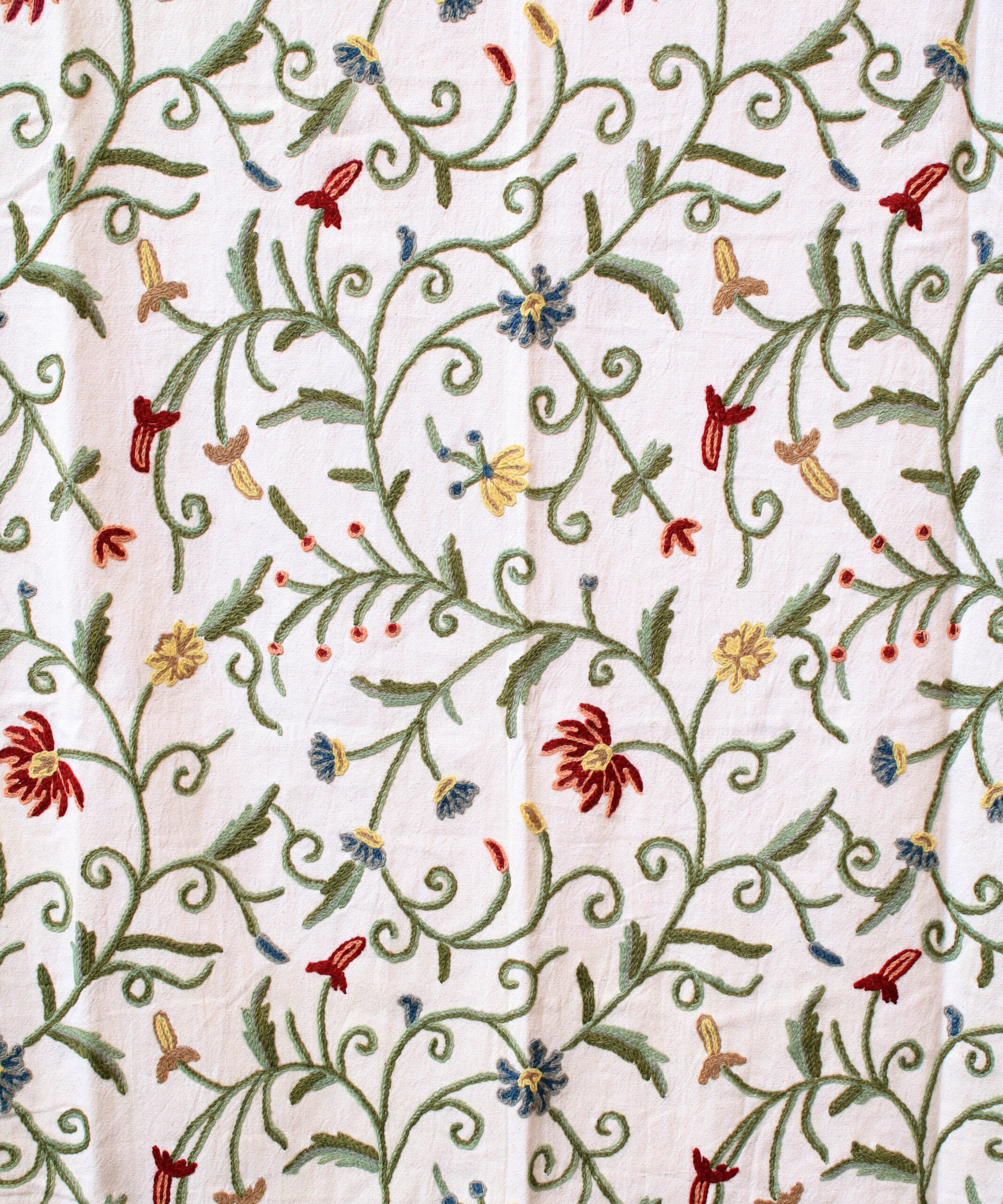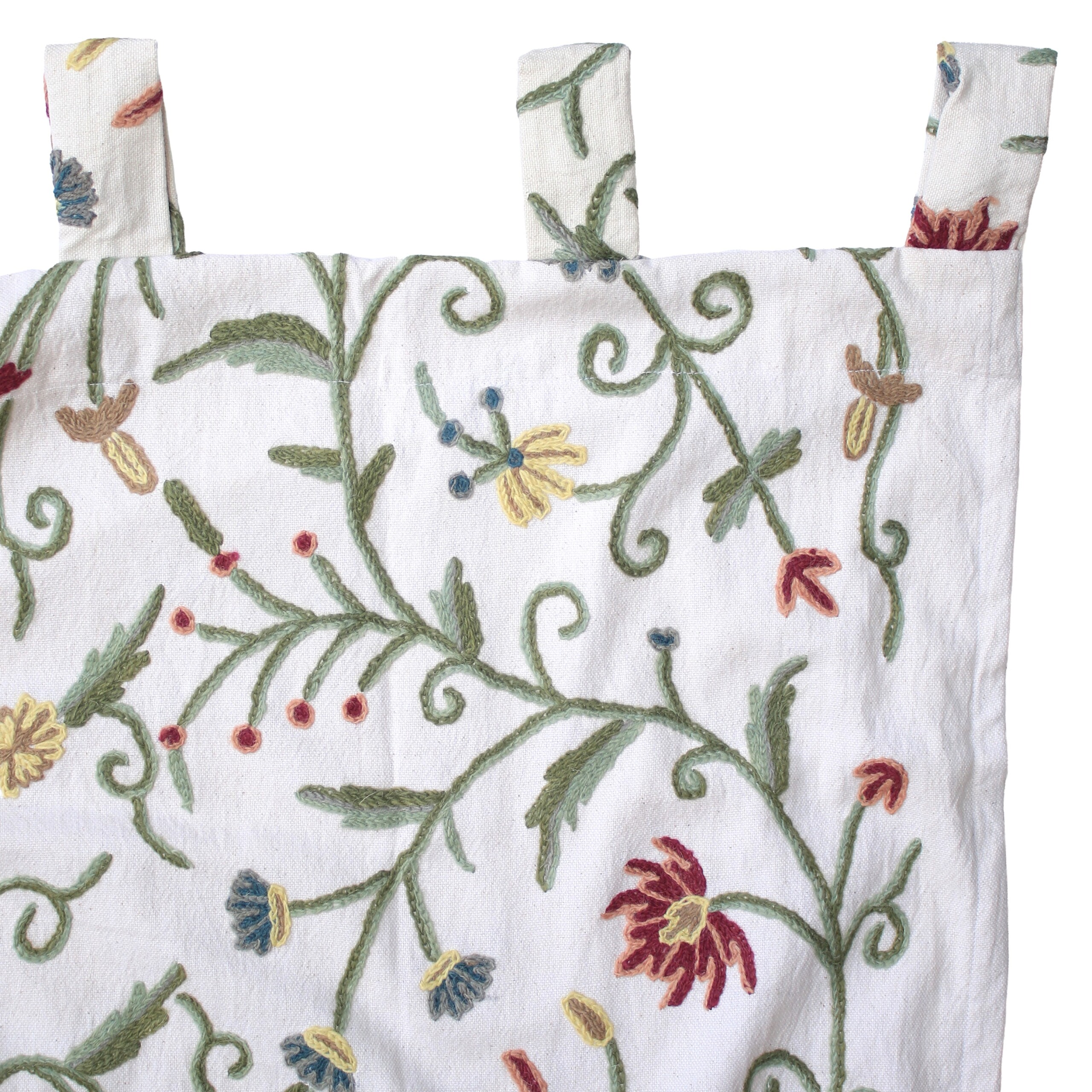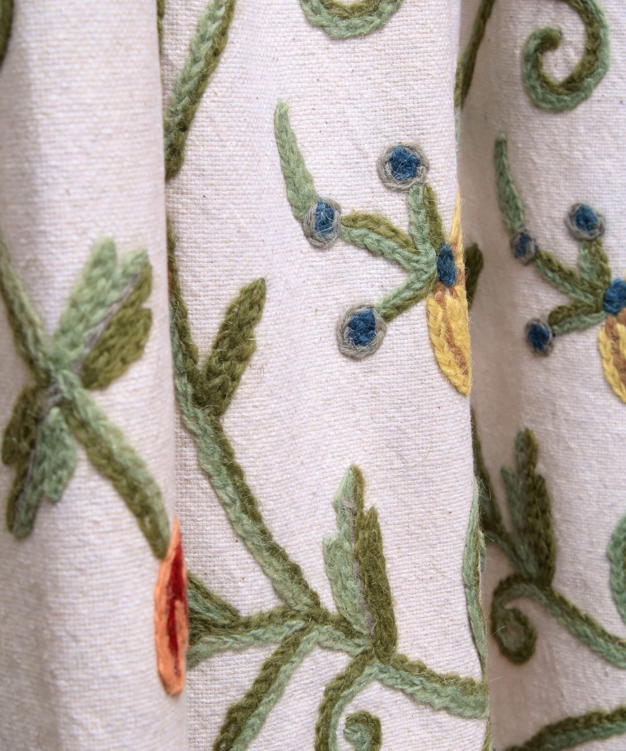 This curtain is handmade in India using the traditional crewel embroidery technique. Traditionally practised in Kashmir, the crewel embroidery is similar to the ari technique, both of which are distinguished by the use of an ari (hook) as the main tool. The thread is held under the fabric and the hook is used to pull the thread up to complete the stitch. In comparison to ari embroidery, crewel embroidery uses a bigger hook and is used to embroider wool onto thicker base fabrics used in curtains and upholstery.