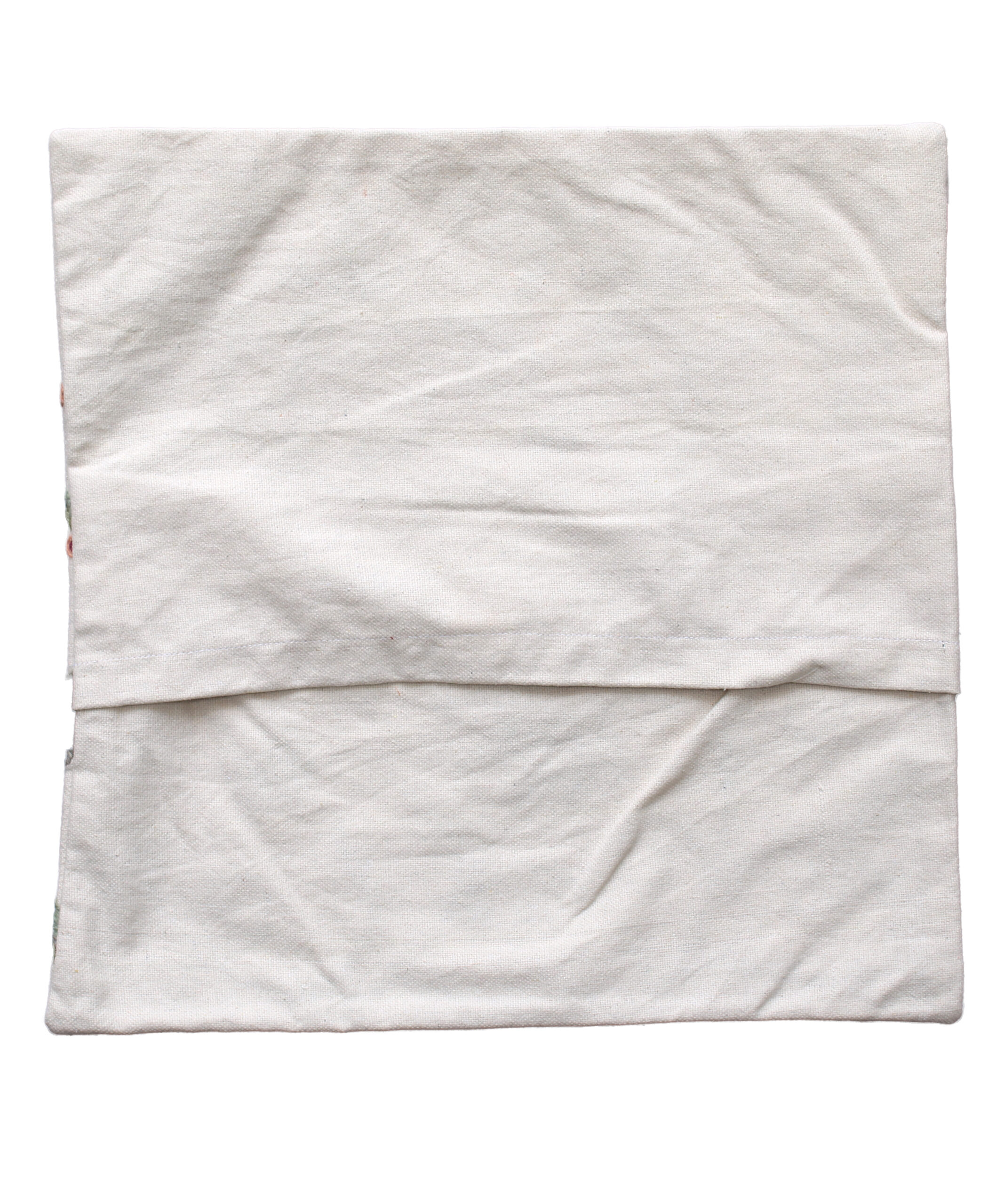 This cushion cover is handmade in India using the traditional crewel embroidery technique. Traditionally practised in Kashmir, the crewel embroidery is similar to the ari technique, both of which are distinguished by the use of an ari (hook) as the main tool. The thread is held under the fabric and the hook is used to pull the thread up to complete the stitch. In comparison to ari embroidery, crewel embroidery uses a bigger hook and is used to embroider wool onto thicker base fabrics used in curtains and upholstery. The cushion cover is crewel embroidered on the front with a plain cotton back same as the base fabric and an envelope opening.