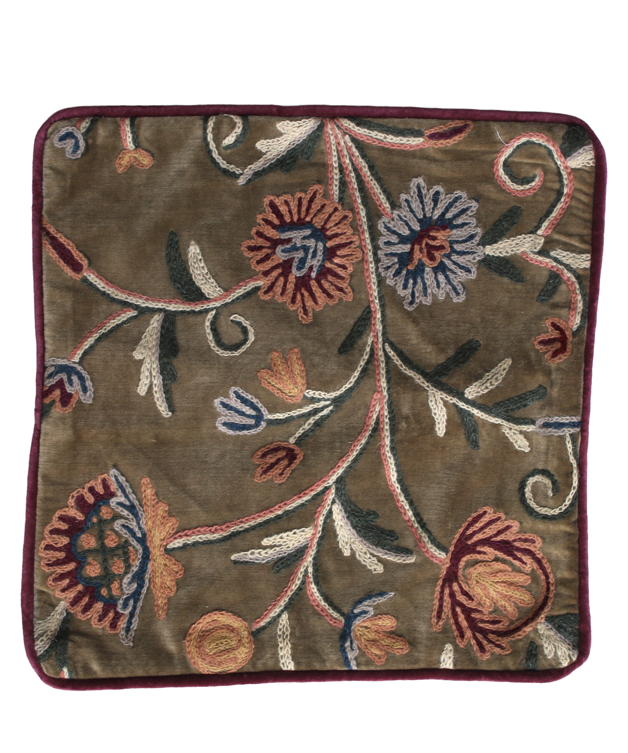 This cushion cover is handmade in India using the traditional crewel embroidery technique. Traditionally practised in Kashmir, the crewel embroidery is similar to the ari technique, both of which are distinguished by the use of an ari (hook) as the main tool. The thread is held under the fabric and the hook is used to pull the thread up to complete the stitch. Crewel embroidery uses a bigger hook and is used to embroider wool onto thicker base fabrics used in curtains and upholstery. The cushion cover is crewel embroidered on the front with a plain velvet back same as the base fabric and an envelope opening.
