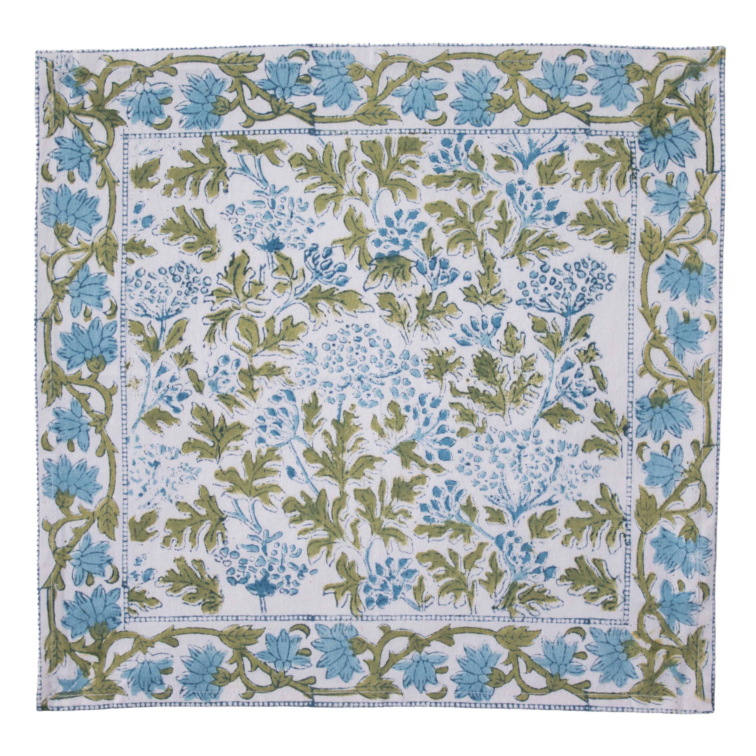 This napkin is handmade in India using traditional block printing techniques. It is made entirely from cotton. The craft process results in irregularities in pattern and colour which makes each piece unique, characteristic of this hand-made process. We also have matching placemats and tablecloths.