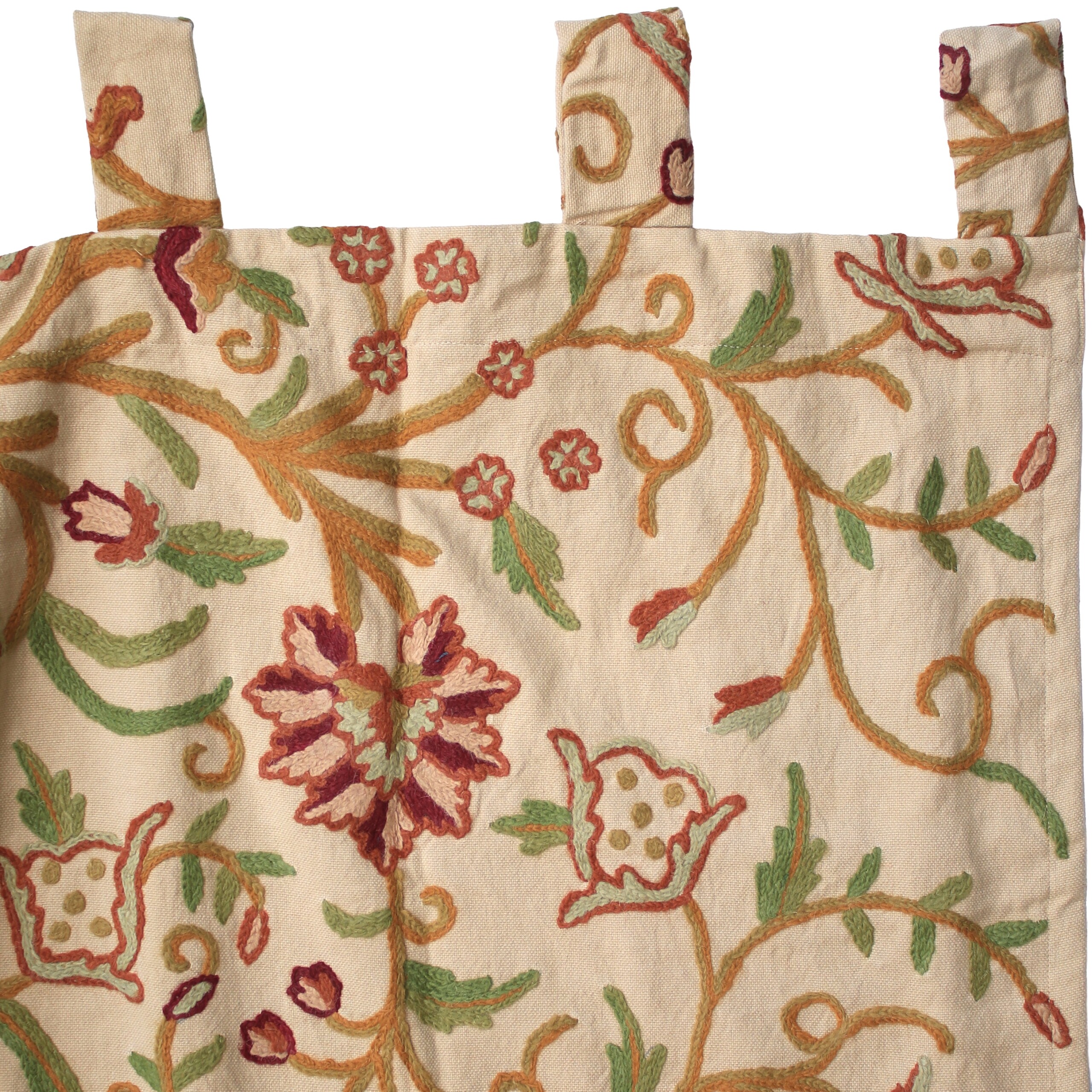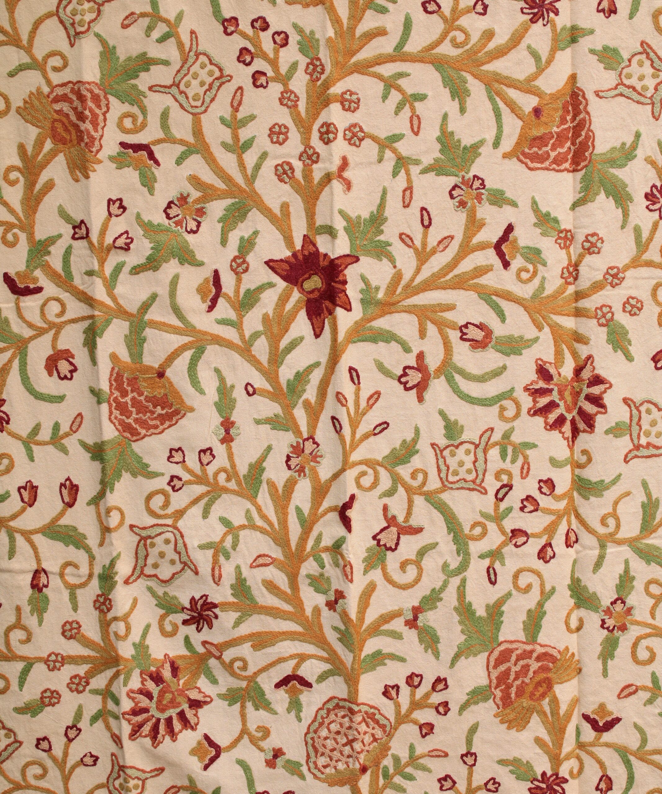 This curtain is handmade in India using the traditional crewel embroidery technique. Traditionally practised in Kashmir, the crewel embroidery is similar to the ari technique, both of which are distinguished by the use of an ari (hook) as the main tool. The thread is held under the fabric and the hook is used to pull the thread up to complete the stitch. In comparison to ari embroidery, crewel embroidery uses a bigger hook and is used to embroider wool onto thicker base fabrics used in curtains and upholstery.