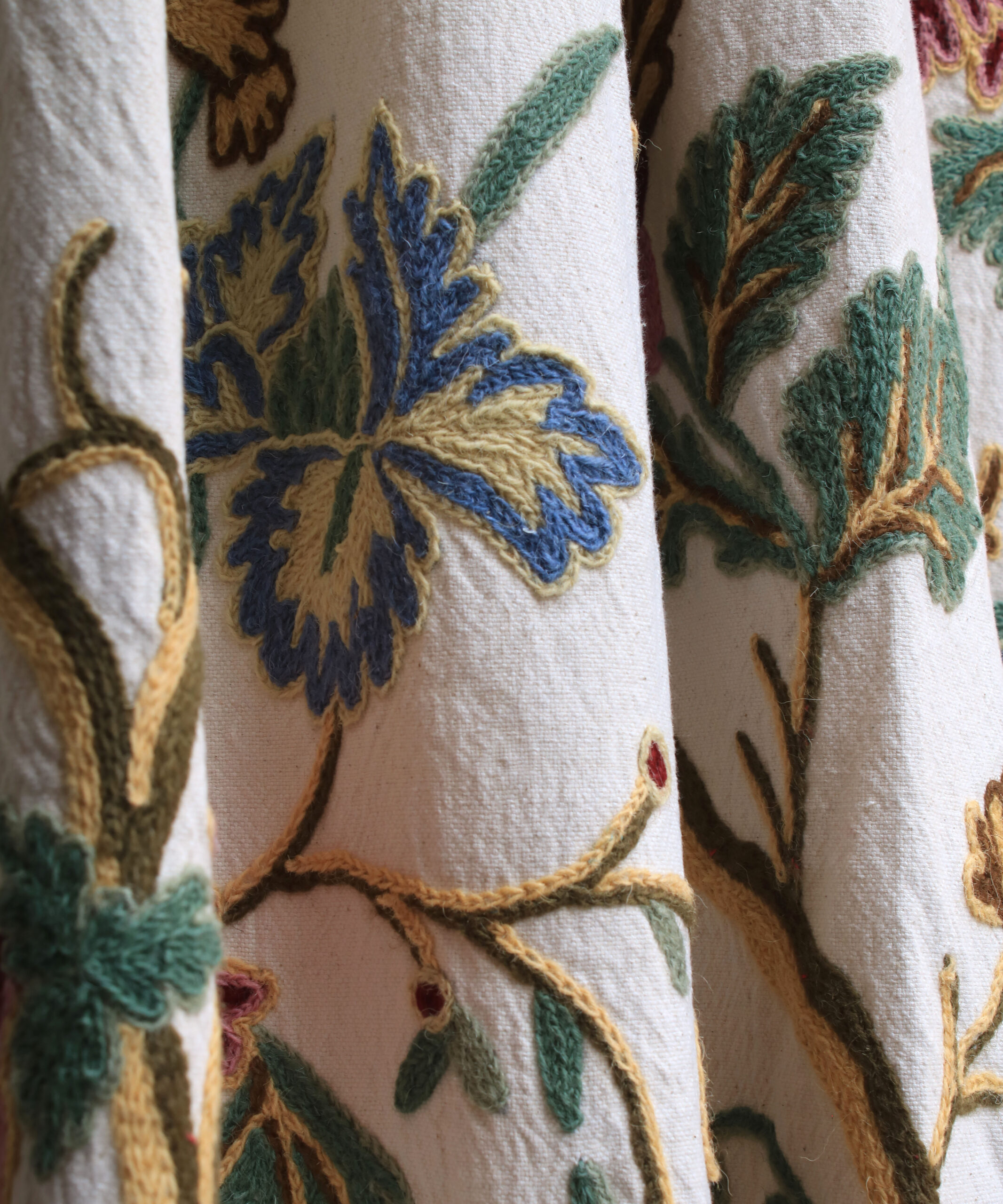 This curtain is handmade in India using the traditional crewel embroidery technique. Traditionally practised in Kashmir, the crewel embroidery is similar to the ari technique, both of which are distinguished by the use of an ari (hook) as the main tool. The thread is held under the fabric and the hook is used to pull the thread up to complete the stitch. In comparison to ari embroidery, crewel embroidery uses a bigger hook and is used to embroider wool onto thicker base fabrics used in curtains and upholstery.