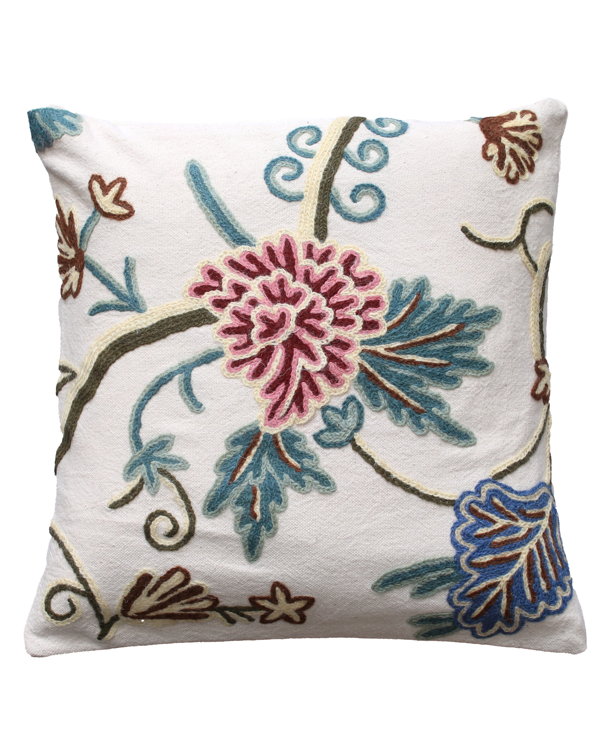 This cushion cover is handmade in India using the traditional crewel embroidery technique. Traditionally practised in Kashmir, the crewel embroidery is similar to the ari technique, both of which are distinguished by the use of an ari (hook) as the main tool. The thread is held under the fabric and the hook is used to pull the thread up to complete the stitch. In comparison to ari embroidery, crewel embroidery uses a bigger hook and is used to embroider wool onto thicker base fabrics used in curtains and upholstery. The cushion cover is crewel embroidered on the front with a plain cotton back same as the base fabric and an envelope opening.