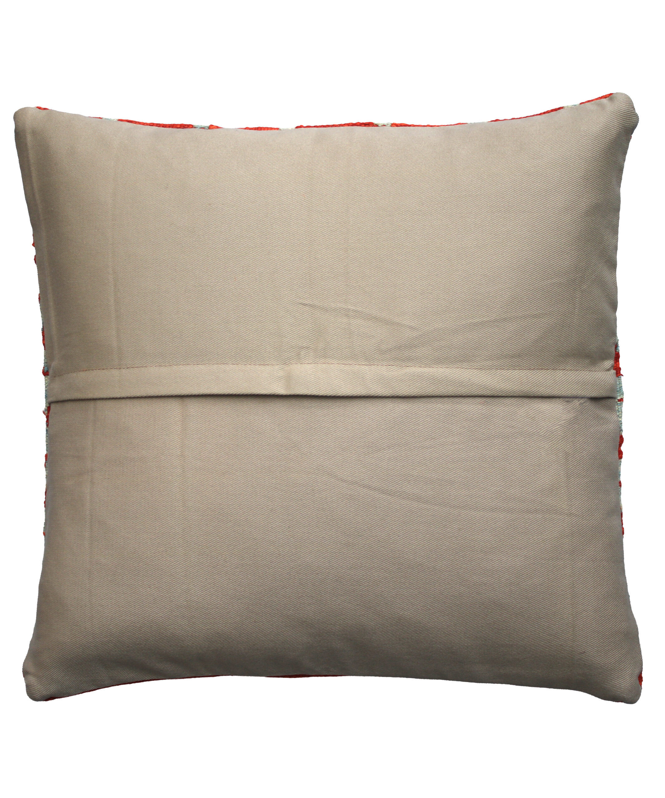 This cushion cover has been made from a handwoven kelim rug from Maimana, Northern Afghanistan. Using local, mostly vegetable dyes, this kelim cushion cover is entirely unique in both geometric patterning, positioning and colouration. There will be subtle irregularities in pattern and colour which is characteristic of the craft process. The back of the cushion is in a neutral tone cotton fabric with a concealed zip fastening.