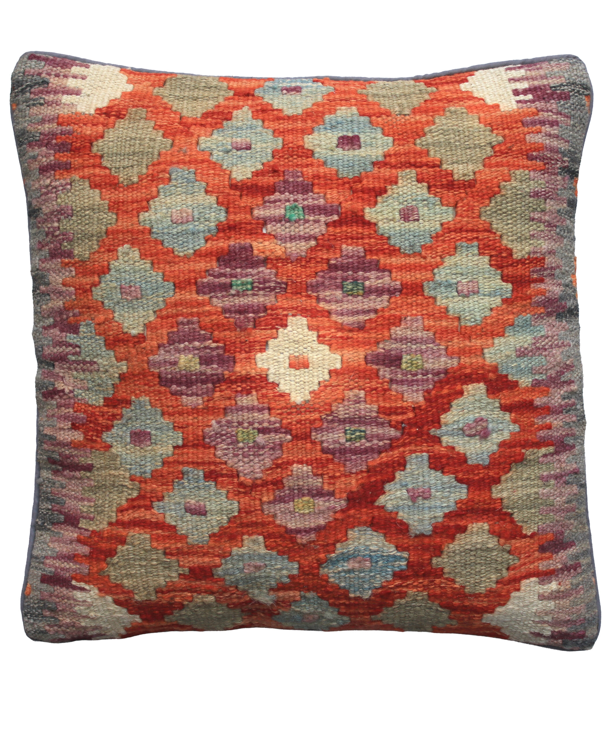 This cushion cover has been made from a handwoven kelim rug from Maimana, Northern Afghanistan. Using local, mostly vegetable dyes, this kelim cushion cover is entirely unique in both geometric patterning, positioning and colouration. There will be subtle irregularities in pattern and colour which is characteristic of the craft process. The back of the cushion is in a neutral tone cotton fabric with a concealed zip fastening.