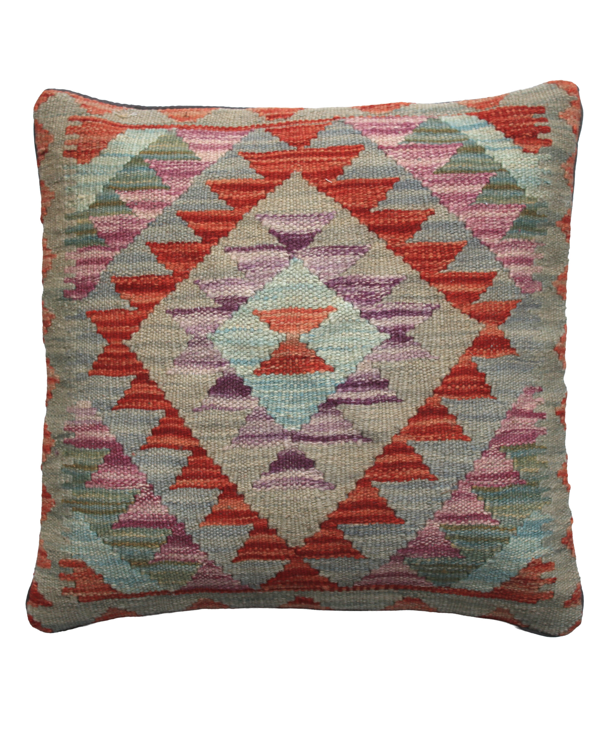 This cushion cover has been made from a handwoven kelim rug from Maimana, Northern Afghanistan. Using local, mostly vegetable dyes, this kelim cushion cover is entirely unique in both geometric patterning, positioning and colouration. There will be subtle irregularities in pattern and colour which is characteristic of the craft process. The back of the cushion is in a neutral tone cotton fabric with a concealed zip fastening.