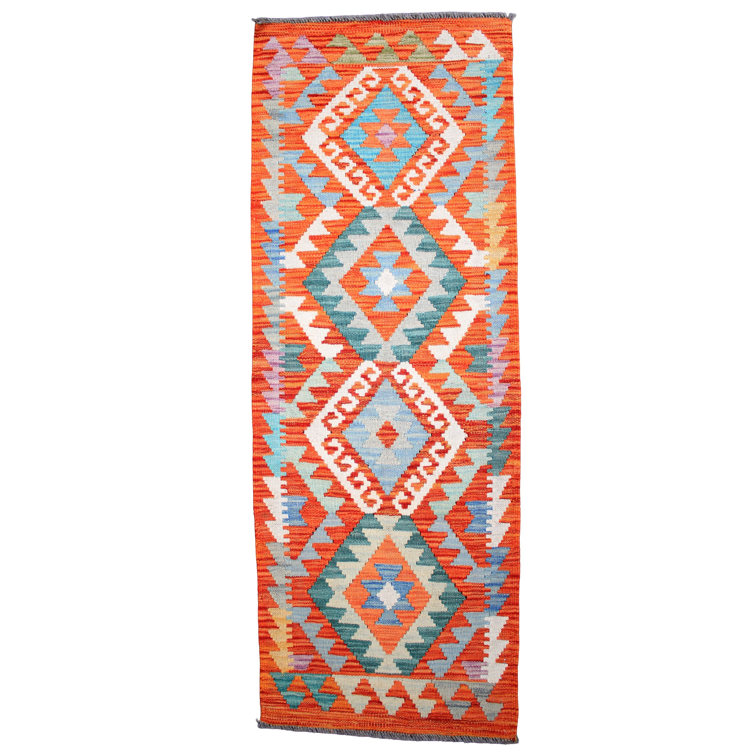 This Kelim runner, handwoven in Maimana, Northern Afghanistan, uses local, mostly vegetable dyes to achieve its bold and bright colouration. This kelim runner is entirely unique in both geometric patterning and design positioning. After the production process using hand-spun wools and a horizontal loom, the kelims are then washed in Lahore, Pakistan. There will be subtle irregularities in pattern and colour which is characteristic of the craft process.