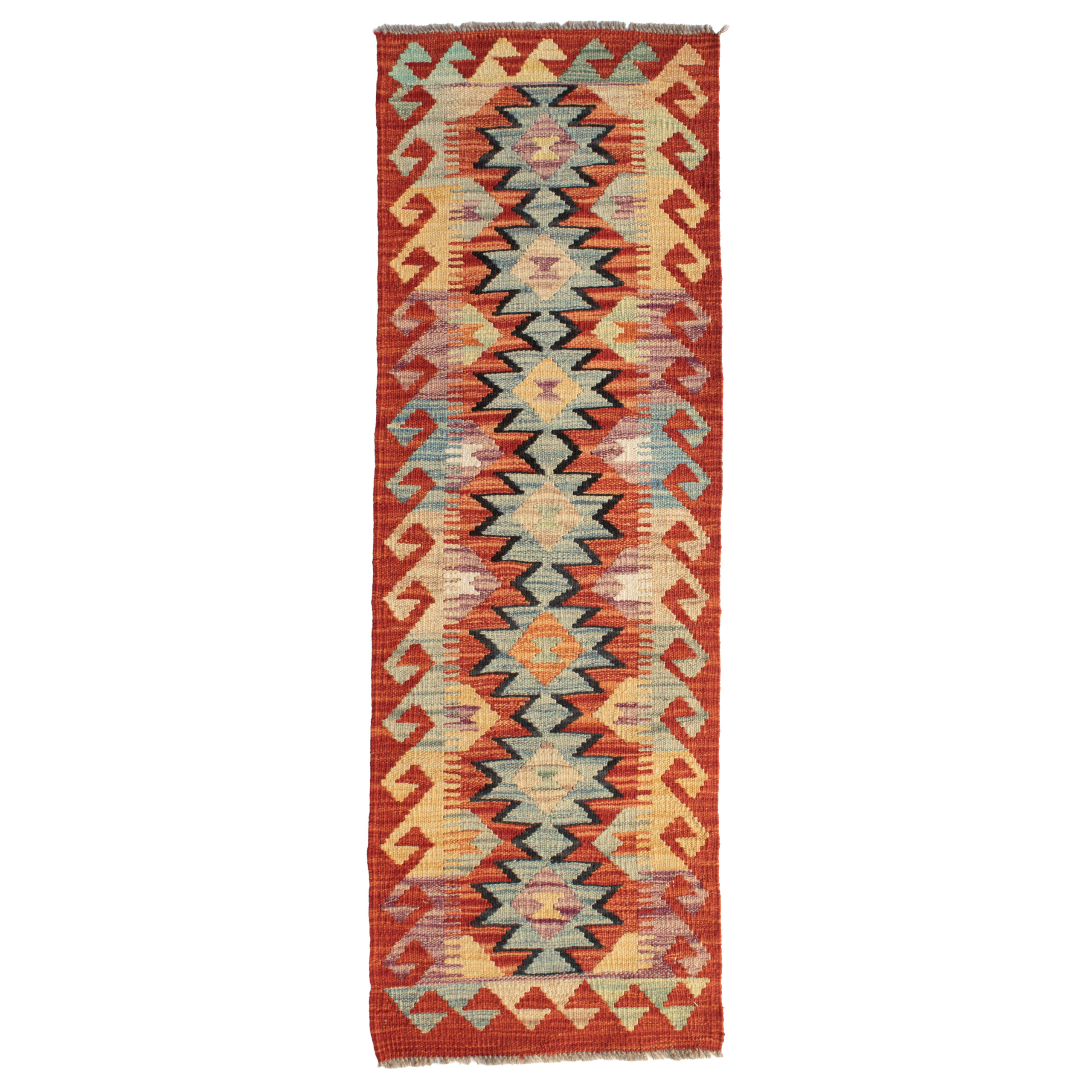 This Kelim runner, handwoven in Maimana, Northern Afghanistan, uses local, mostly vegetable dyes to achieve its bold and bright colouration. This kelim runner is entirely unique in both geometric patterning and design positioning. After the production process using hand-spun wools and a horizontal loom, the kelims are then washed in Lahore, Pakistan. There will be subtle irregularities in pattern and colour which is characteristic of the craft process.