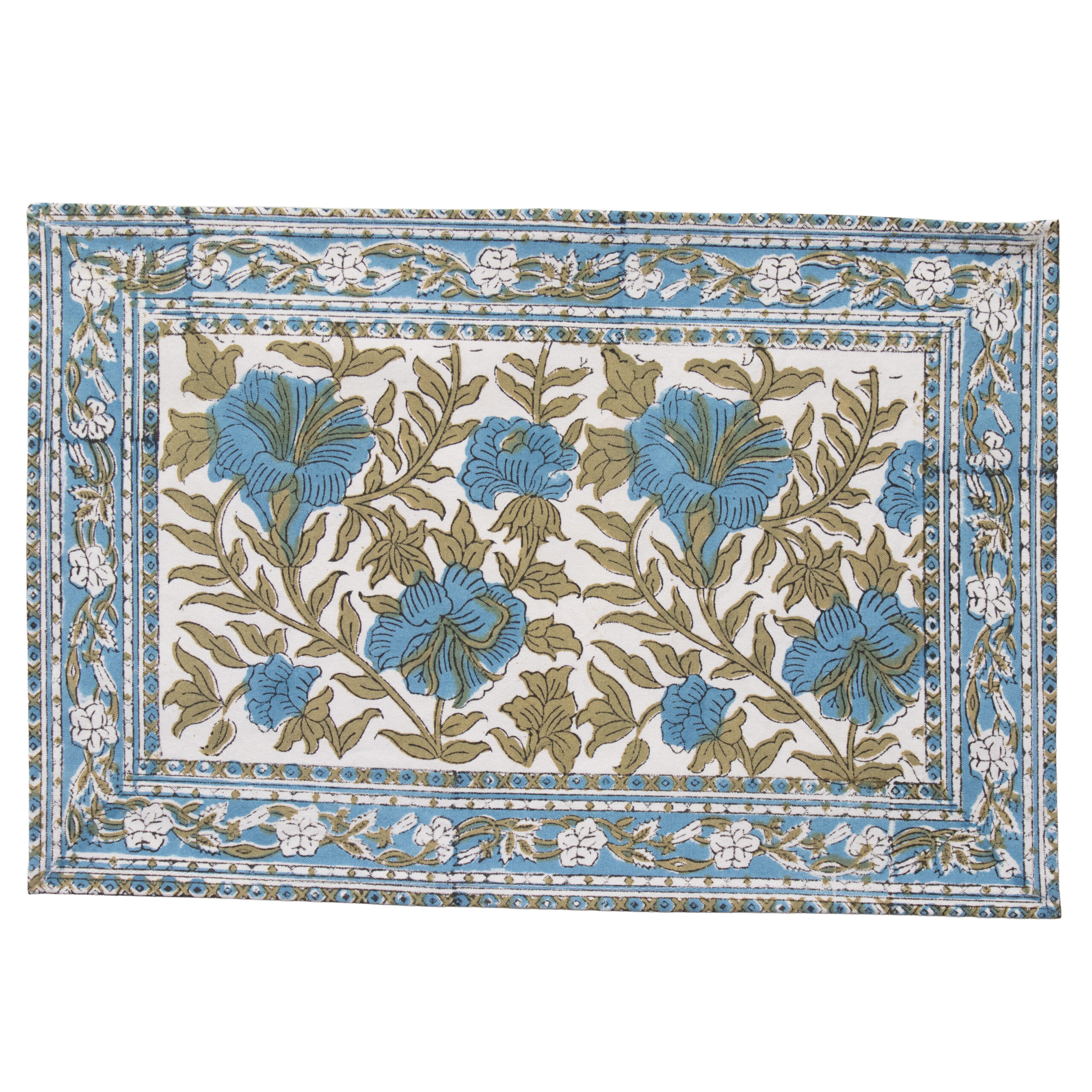 This placemat is handmade in India using traditional block printing techniques. It is made entirely from cotton canvas fabric and printed on one side. The craft process results in irregularities in pattern and colour which makes each piece unique, characteristic of this hand-made process. We also have matching tablecloths and napkins.