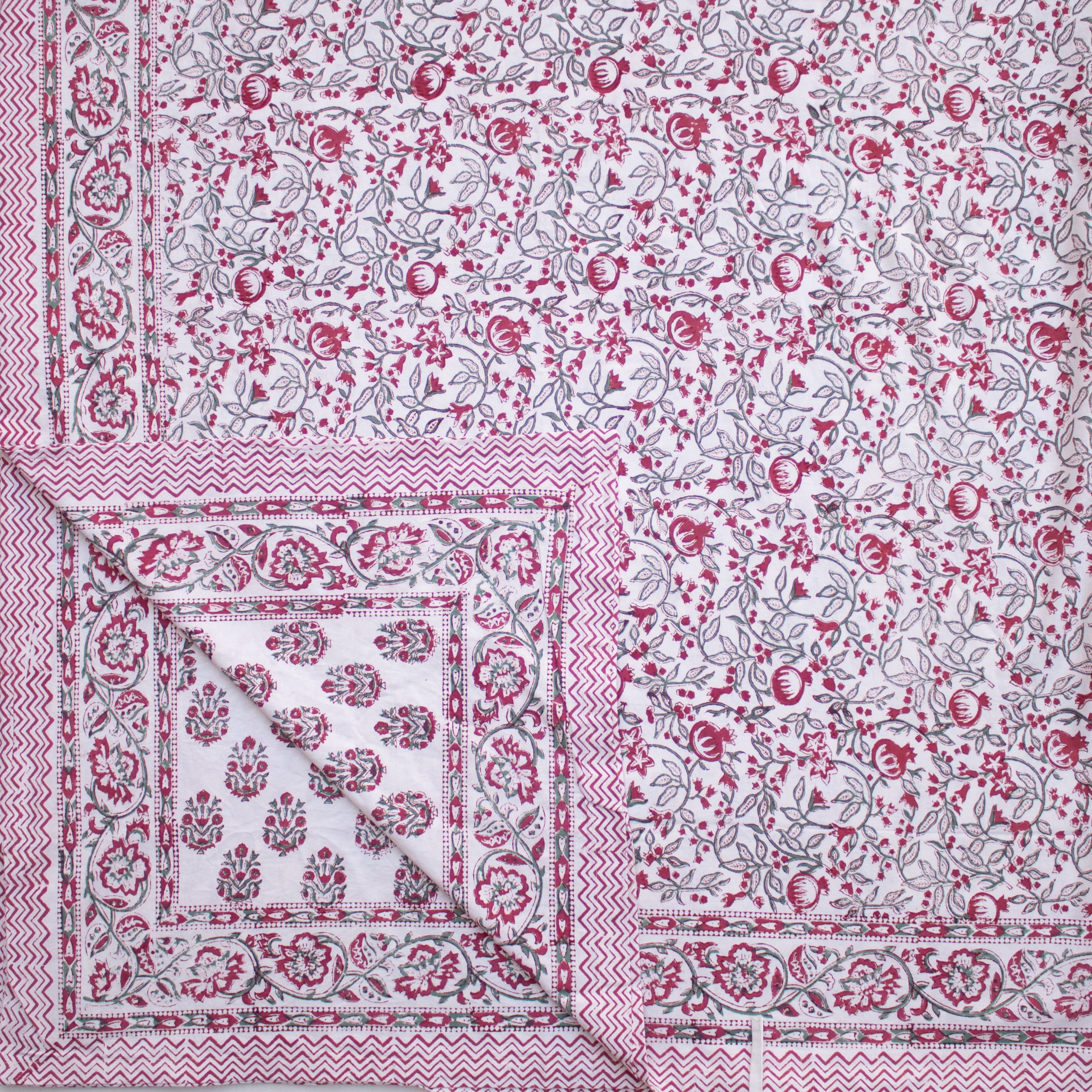 This duvet cover is handmade in India using traditional block printing techniques. It is reversible with designs on both sides. It is made entirely from cotton with ties at the end for fastening. There will be subtle irregularities in pattern and colour which is characteristic of the craft process. This makes each piece unique.