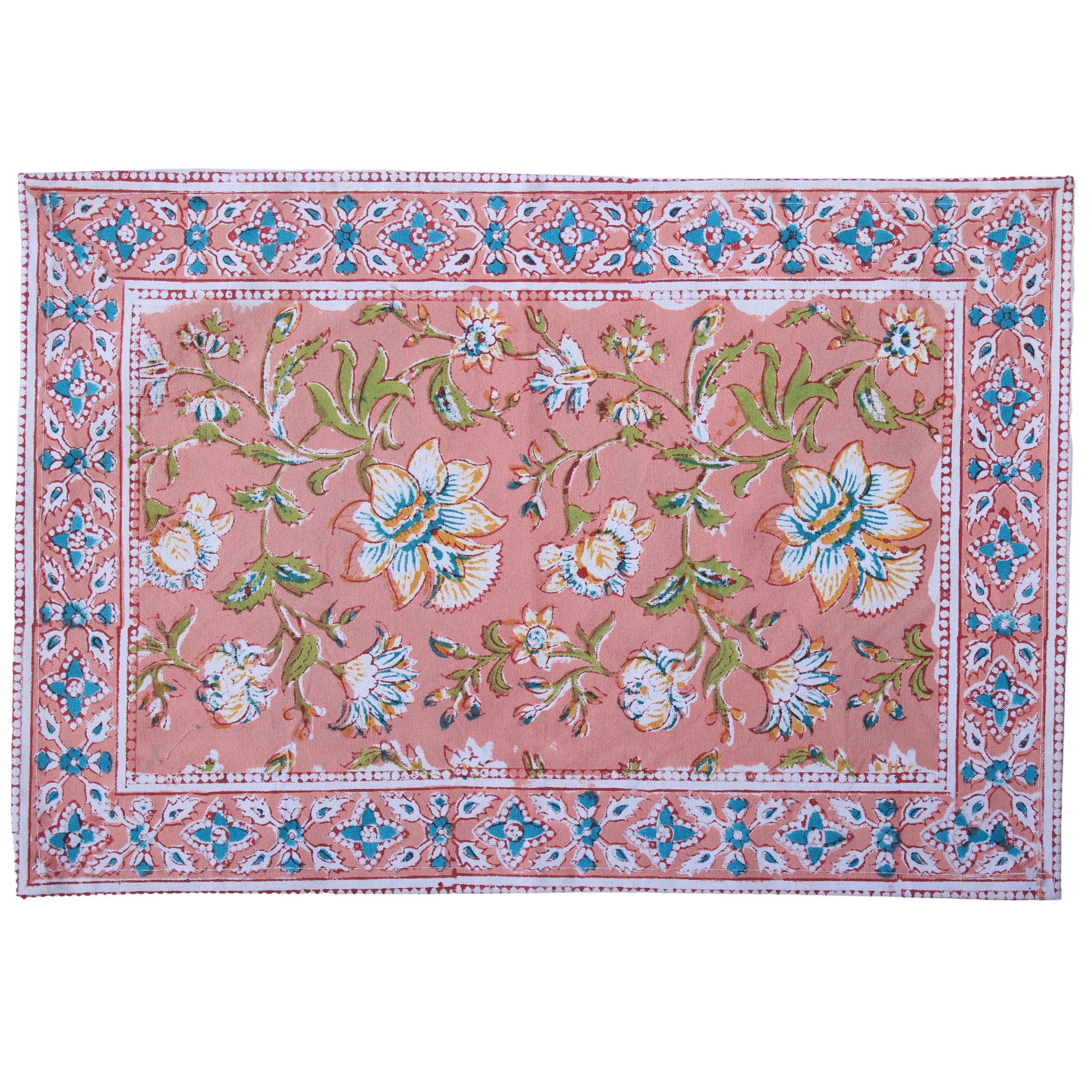 This placemat is handmade in India using traditional block printing techniques. It is made entirely from cotton canvas fabric and printed on one side. The craft process results in irregularities in pattern and colour which makes each piece unique, characteristic of this hand-made process. We also have matching tablecloths and napkins.