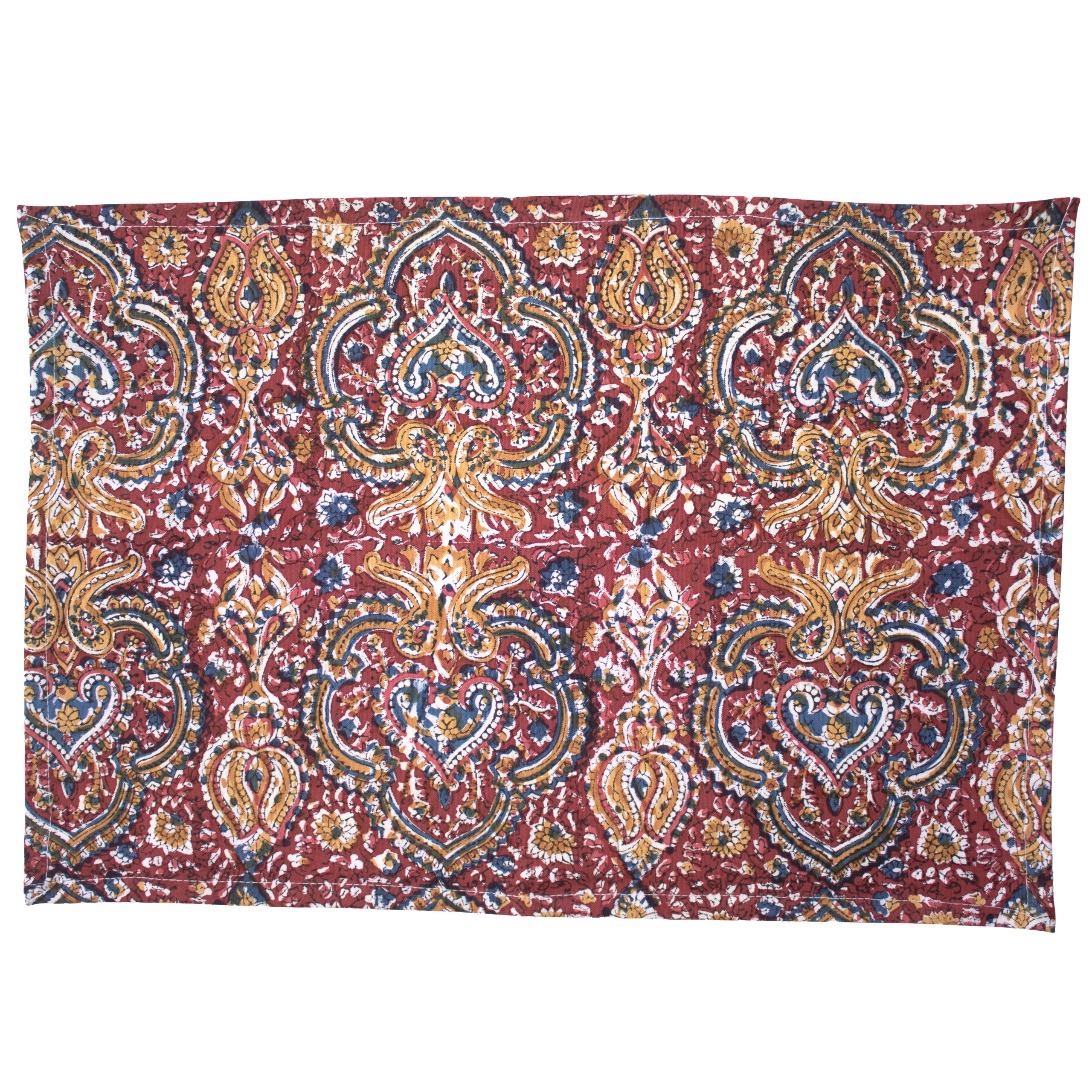 This placemat is handmade in India using traditional block printing techniques. It is made entirely from cotton canvas fabric and printed on one side. The craft process results in irregularities in pattern and colour which makes each piece unique, characteristic of this hand-made process. We also have matching tablecloths and napkins.