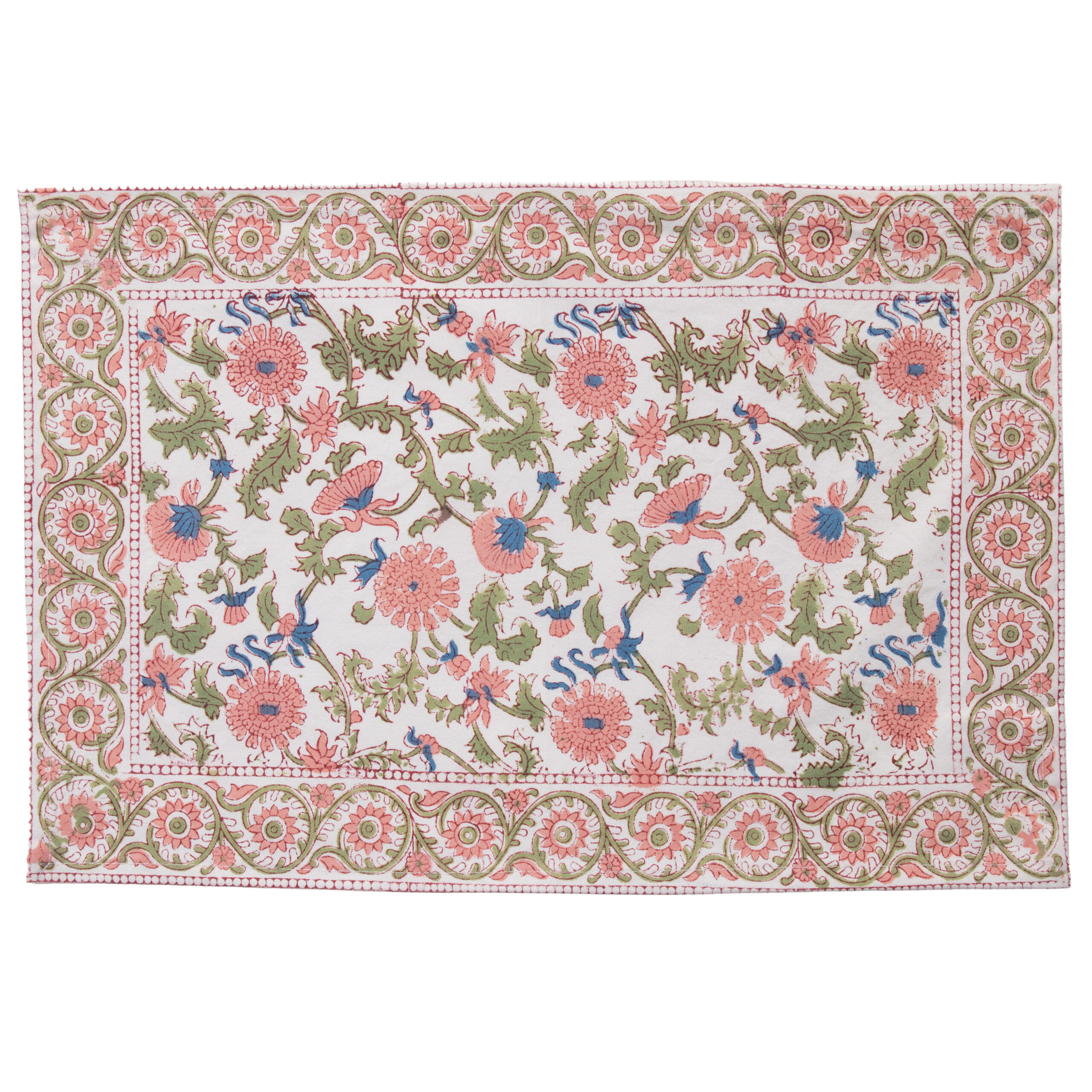 This placemat is handmade in India using traditional block printing techniques. It is made entirely from cotton canvas fabric and printed on one side. The craft process results in irregularities in pattern and colour which makes each piece unique, characteristic of this hand-made process. We also have matching tablecloths and napkins.